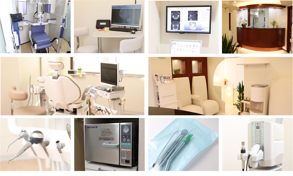 当院では体への負担が少ないデジタルX線を使用しています。口腔内を3次元的に診査できるCTや、インビザライン矯正歯科治療に必須のセファロ(頭部X線規格写真)も完備しています。また、滅菌消毒などの感染対策も徹底しております。患者さまの希望やお悩みにじっくり向き合うため、リラックスして治療が受けられるような歯科医院づくりをしています。